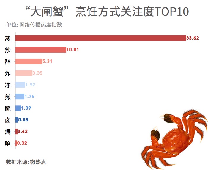 在“吃貨”眼里,占據(jù)C位的仍是最著名的“中華絨螯蟹”,也就是人們俗稱的“大閘蟹”。在“不同蟹類網(wǎng)絡關注度調查”中,大閘蟹名列前茅,緊隨其后的是梭子蟹和青蟹 。