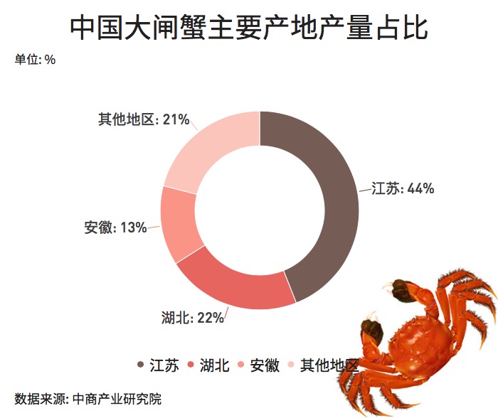大閘蟹的十大產(chǎn)區(qū)中,江蘇占據(jù)半壁江山,固城湖、洪澤湖、太湖、高郵湖、陽澄湖產(chǎn)區(qū)都在江蘇,江蘇總產(chǎn)量約占全國的44%,市場最受歡迎的陽澄湖大閘蟹與洪澤湖大閘蟹都是產(chǎn)自江蘇。
