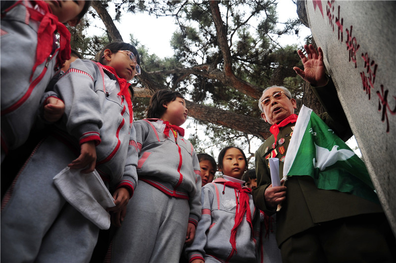 在沈陽抗美援朝烈士陵園,志愿軍老戰(zhàn)士李維波(左一)向?qū)W生們講述邱少云的英雄事跡(2014年4月3日攝)。新華社發(fā)(張文魁攝)