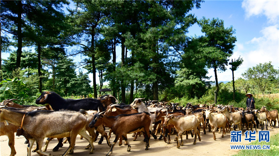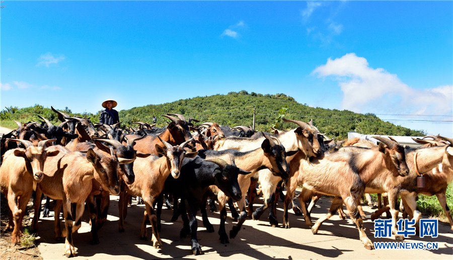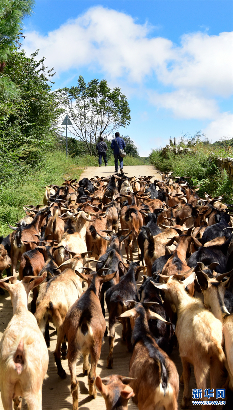 在云南省彌勒市東山鎮(zhèn)舍母村委會(huì)小橫山村,當(dāng)?shù)乩蒙鷳B(tài)草場(chǎng)優(yōu)勢(shì)大力發(fā)展生態(tài)羊養(yǎng)殖,戶(hù)均養(yǎng)殖100多只,成為村民們的致富新手段。(10月11日攝)。新華網(wǎng)發(fā)(普佳勇 攝)