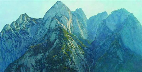 作品《神屏》,始于2013年春季寫生,東仰太華的清晨,主峰巍峨,山谷靜悄悄的,逆光下的高山統(tǒng)一在多層次的藍(lán)色調(diào)里,復(fù)雜的山石結(jié)構(gòu)則需要反反復(fù)復(fù)耐心的修改塑造,畫長(zhǎng)三米九,高兩米。