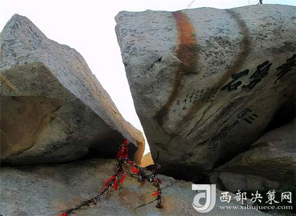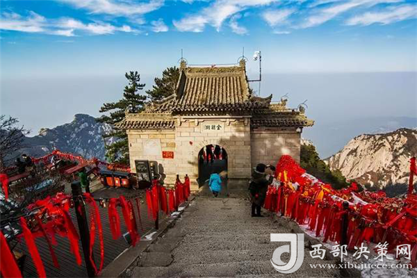 金鎖關(guān)是建在三峰口的一座城樓般石拱門,是經(jīng)五云峰通往東西南峰的咽喉要道,鎖關(guān)后則無路可通。杜甫《望岳》詩(shī)中“箭栝通天有一門”就是指的這里。道家認(rèn)為,華岳為仙鄉(xiāng)神府,只有過了通天門,才算進(jìn)入仙境。所以有“過了金鎖關(guān),另是一重天的”的民謠。