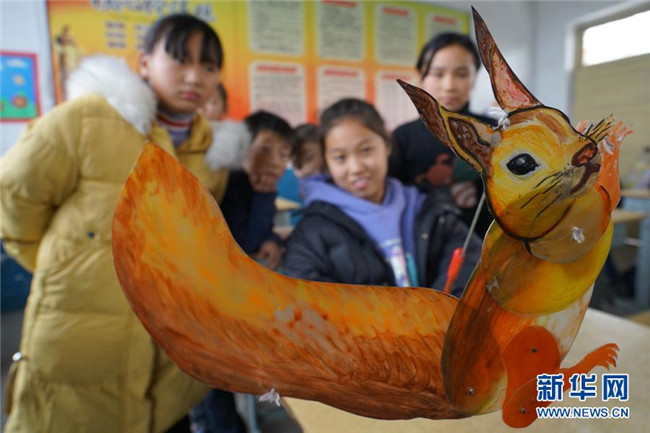 11月24日,皮影戲藝人在河北省沙河市西油村小學(xué)為學(xué)生講解皮影戲道具使用方法。新華社記者 范世輝 攝