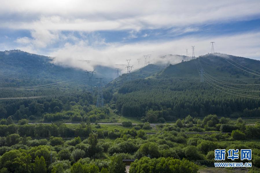 內(nèi)蒙古阿爾山市五岔溝鎮(zhèn)大山深處,輸電塔高聳山間(7月4日攝)。 新華社發(fā)(畢力格 攝)