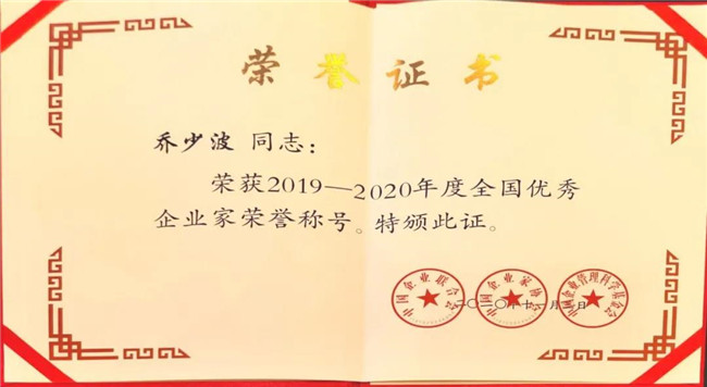 12月1日,以“弘揚(yáng)優(yōu)秀企業(yè)家精神,勇于創(chuàng)新?lián)?dāng)奉獻(xiàn)”為主題的“2020年全國(guó)企業(yè)家活動(dòng)日暨中國(guó)企業(yè)家年會(huì)”在廣東省東莞市舉行。會(huì)上表彰了154名優(yōu)秀企業(yè)家,公司董事長(zhǎng)、總經(jīng)理喬少波喜獲“2019-2020年全國(guó)優(yōu)秀企業(yè)家”稱(chēng)號(hào)。