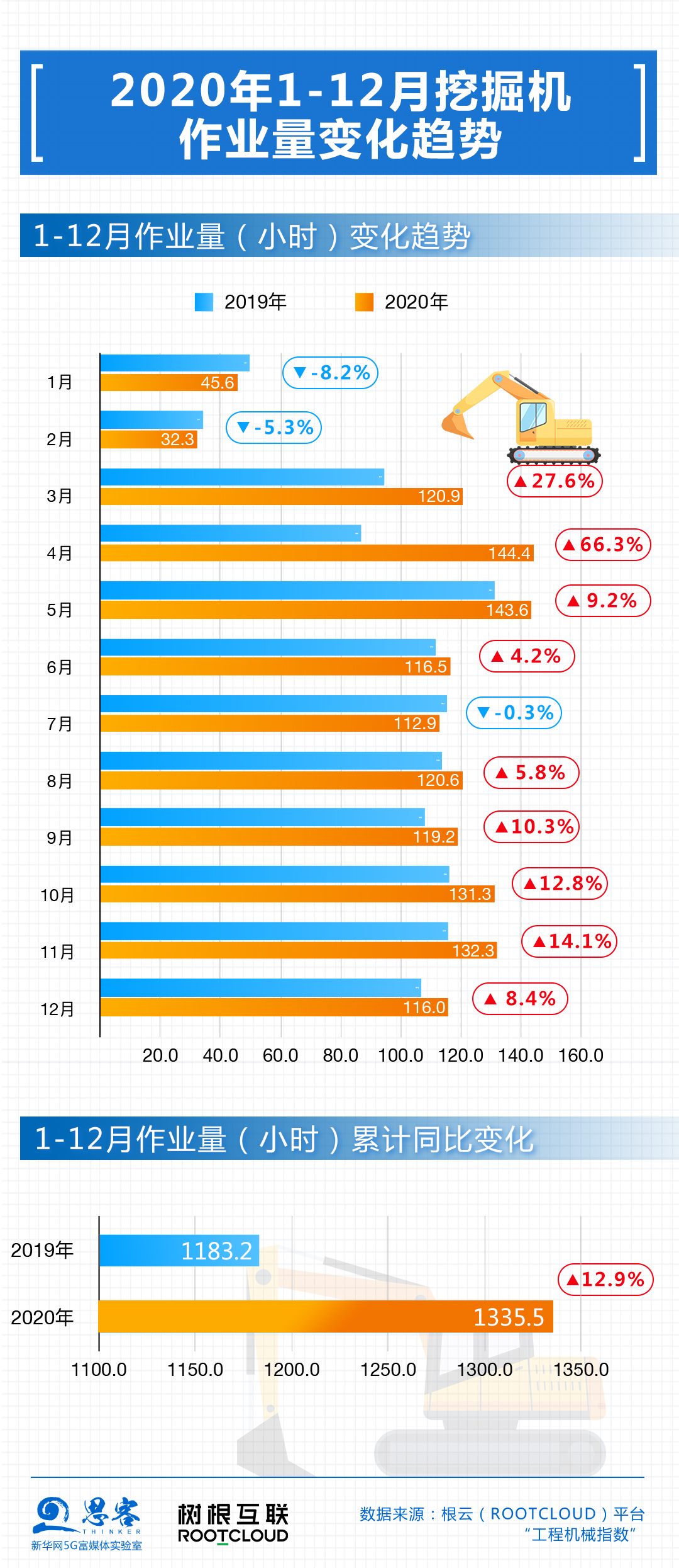 從三一重工孵化的工業(yè)互聯(lián)網(wǎng)平臺——樹根平臺的“工程機(jī)械指數(shù)”實時數(shù)據(jù)看,2020年全年挖掘機(jī)累計工作時間超越去年同期,同比上漲12.9%。與此同時,四季度數(shù)據(jù)尤其令人欣喜,10月、11月、12月三個月份從銷量到工作時間,均保持較為高速和平穩(wěn)的增長。樹根互聯(lián)聯(lián)合創(chuàng)始人、CEO賀東東說,“挖掘機(jī)指數(shù)”不僅反映經(jīng)濟(jì)活力,還清晰展現(xiàn)中國基建的火熱圖景。