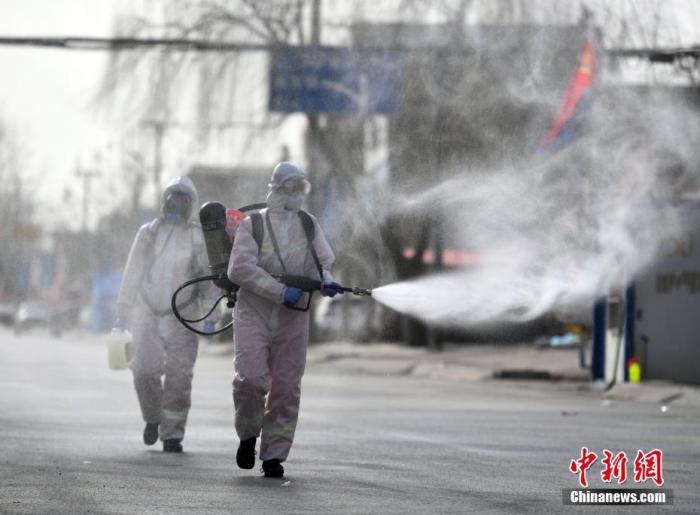 1月15日,石家莊消防救援支隊藁城大隊消防員在小果莊村村口路段消殺。當日,河北省石家莊市藁城區(qū)開展防疫消殺工作。 中新社記者 翟羽佳 攝