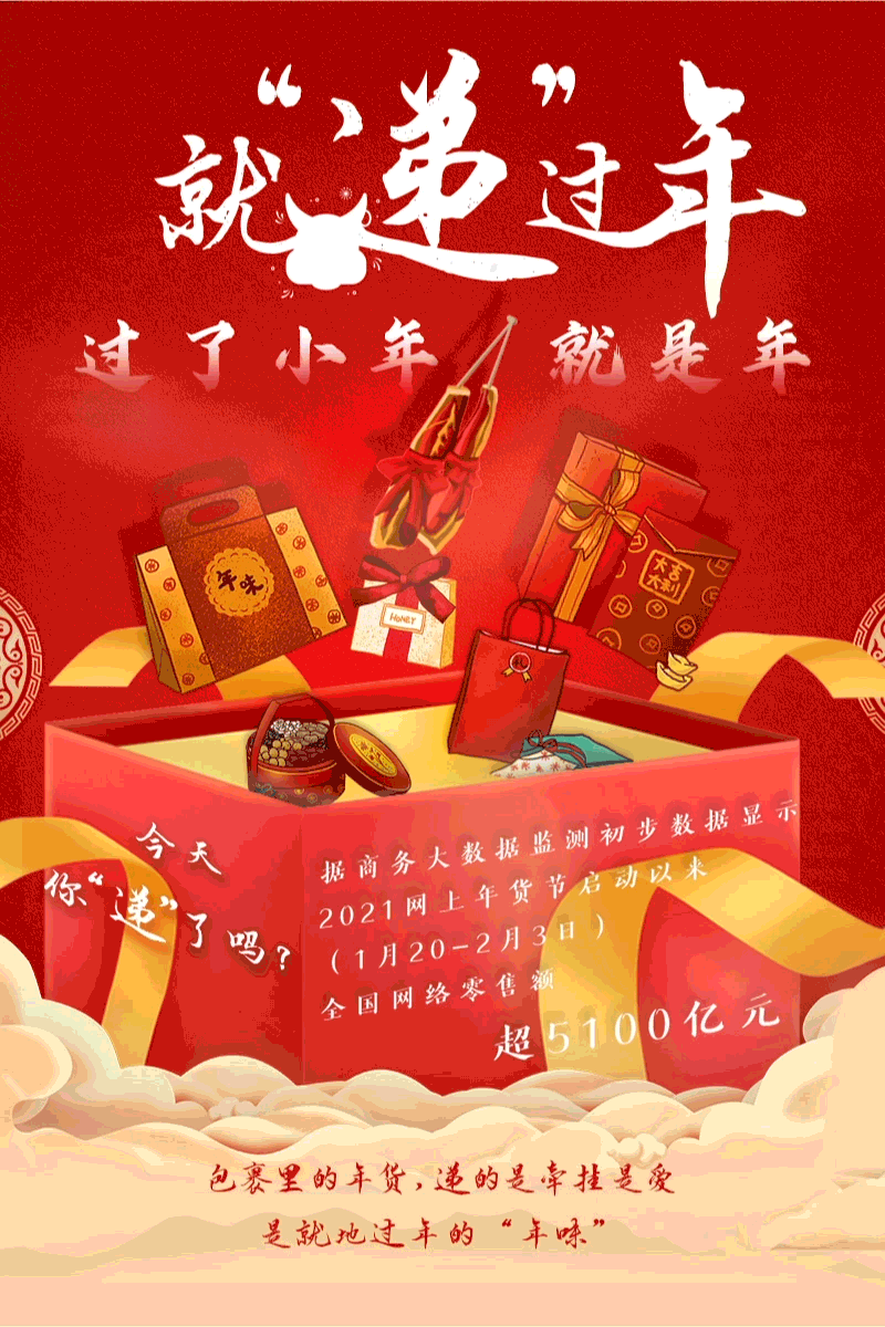 就地過年,年味不減。商務(wù)部2月4日發(fā)布數(shù)據(jù),由商務(wù)部等部門指導(dǎo)開展的“2021年全國網(wǎng)上年貨節(jié)”,自1月20日啟動以來,全國網(wǎng)絡(luò)零售額已超5100億元。“云”購年貨,就“遞”過年,成為人們的新年俗。(記者于佳欣、王雨蕭,設(shè)計張晨光)