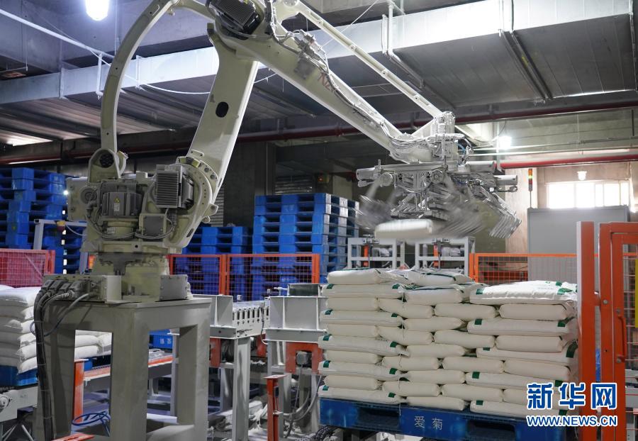 在西安國際港務區(qū)愛菊農(nóng)產(chǎn)品物流加工園區(qū)內(nèi),面粉生產(chǎn)線上的機械臂在碼放包裝好的面粉(2020年4月8日攝)。 新華社記者 邵瑞 攝