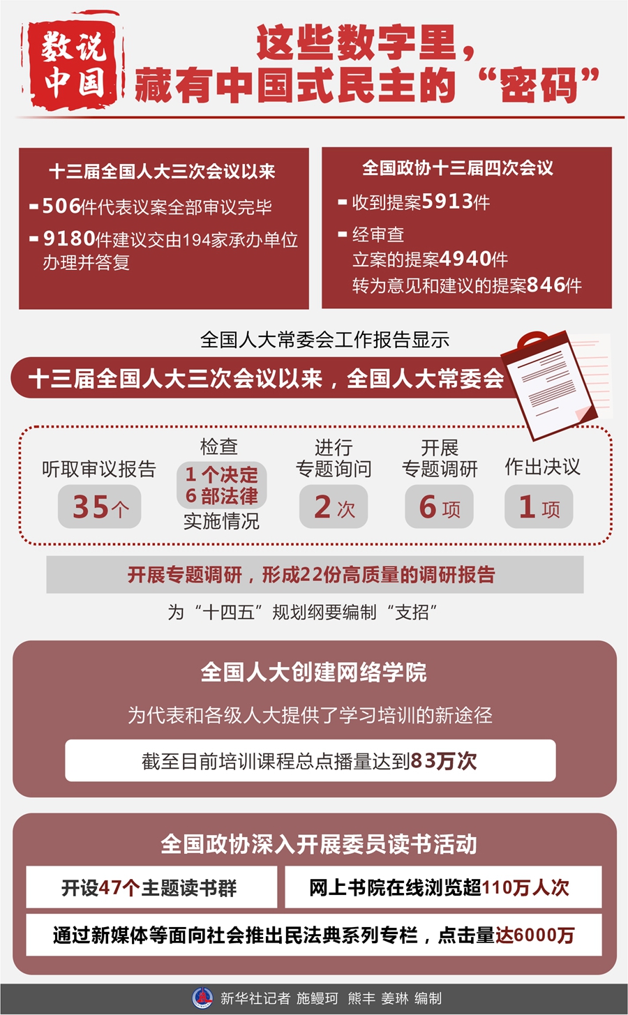數(shù)字,蘊藏中國式民主的“密碼”。透過全國人大常委會工作報告、全國政協(xié)常委會工作報告和提案工作情況報告,讓我們從幾組關鍵數(shù)據(jù)進行“解碼”。