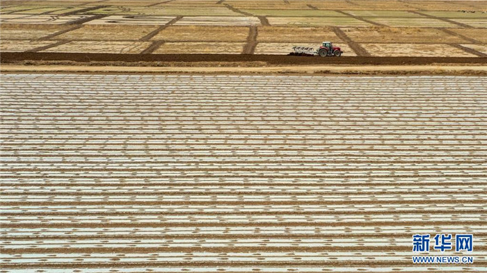 在新疆尉犁縣塔里木鄉(xiāng)英努爾村,農民駕駛大馬力拖拉機在棉田里進行鋪膜作業(yè)(3月28日攝)。新華社發(fā)(汪志鵬 攝)