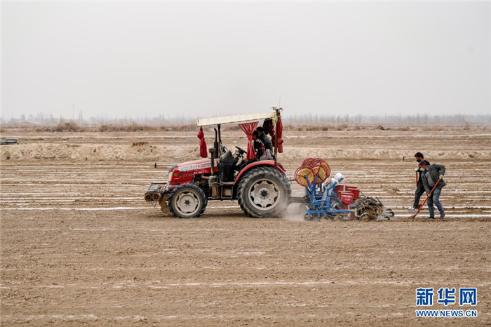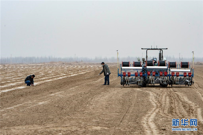 在位于新疆喀什地區(qū)莎車縣的棉田里,農民在播種棉籽(3月26日攝)。新華社記者 馬鍇 攝