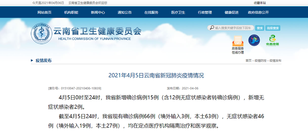 截至4月5日24時,我省現(xiàn)有確診病例66例(境外輸入3例,本土63例),無癥狀感染者46例(境外輸入19例,本土27例),均在定點醫(yī)療機構隔離治療和醫(yī)學觀察。