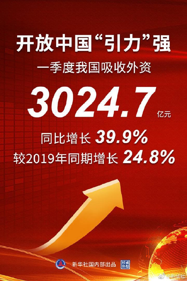 商務(wù)部15日發(fā)布數(shù)據(jù)顯示,一季度,我國新設(shè)外商投資企業(yè)10263家,同比增長47.8%;實際使用外資金額3024.7億元,同比增長39.9%。