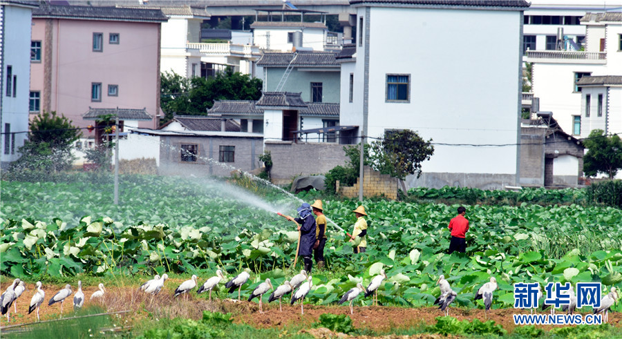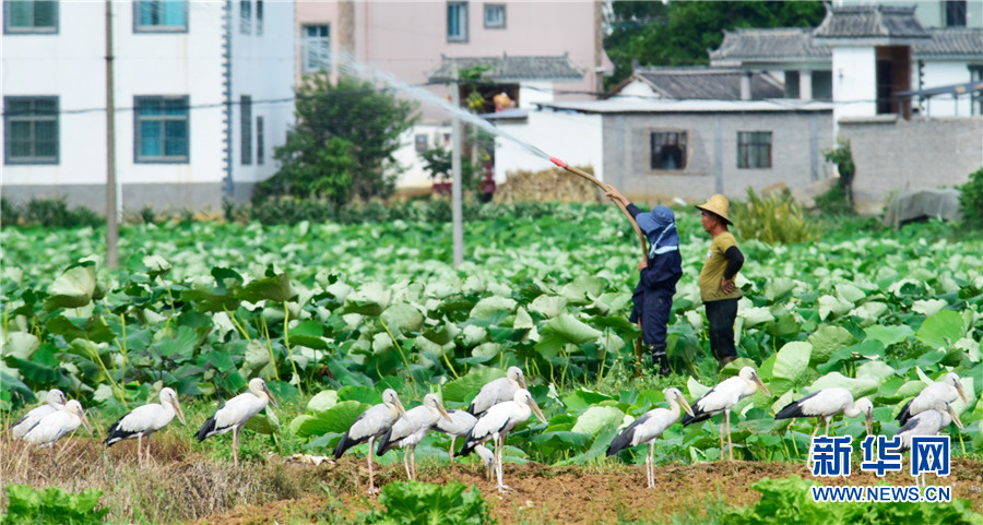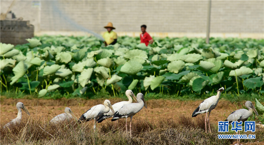 近日,云南省彌勒市竹園鎮(zhèn)農(nóng)民在荷田間勞作,不遠處許多鉗嘴鸛在田邊地頭棲息覓食,一幅人鳥和諧的生態(tài)畫卷徐徐展開。2006年,中國在云南大理首次記錄到鉗嘴鸛。近年來,隨著生態(tài)環(huán)境不斷改善,云南多地均發(fā)現(xiàn)鉗嘴鸛。新華網(wǎng)發(fā)(普佳勇攝影報道)