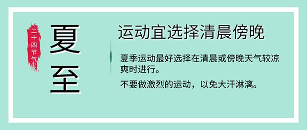 夏季運(yùn)動(dòng)時(shí)間宜在清晨或傍晚,此時(shí)天氣涼爽,可以采用健步走、慢跑、太極拳等運(yùn)動(dòng)緩和的項(xiàng)目進(jìn)行體育鍛煉,宜避開(kāi)烈日熾熱之時(shí)且不宜做過(guò)分劇烈的活動(dòng),以免汗出太過(guò),損傷陽(yáng)氣,耗傷陰氣,且運(yùn)動(dòng)后不可用冷水淋浴或沖頭。