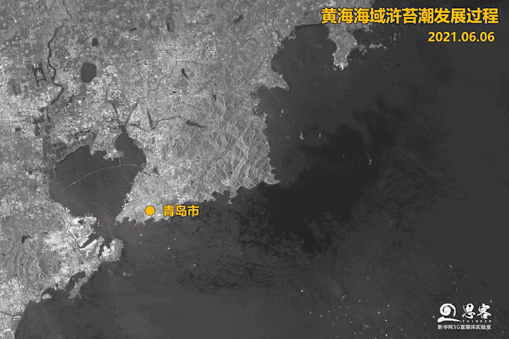▲圖為SAR衛(wèi)星拍攝的黃海海域時(shí)序動(dòng)態(tài)圖,可以清晰地看到滸苔潮發(fā)展的過程。