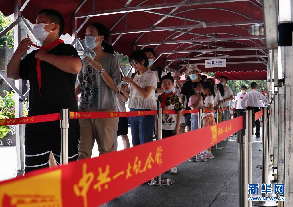 7月11日,觀眾在中共一大紀(jì)念館前的遮陽棚下排隊等待參觀。新華社記者 劉穎 攝