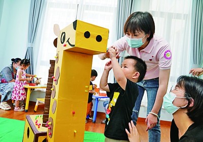 在上海奉賢區(qū)奉浦街道秦塘生活驛站,早教老師在指導(dǎo)小朋友玩游戲。新華社發(fā)