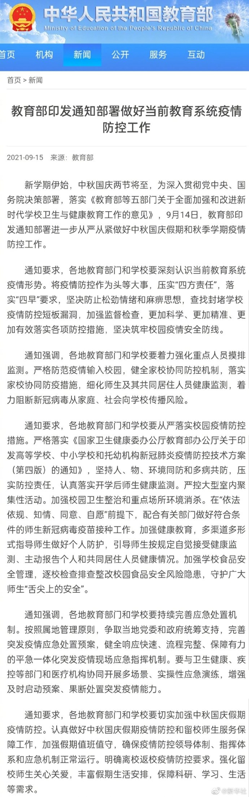 記者15日從教育部獲悉,教育部日前印發(fā)通知部署進(jìn)一步從嚴(yán)從緊做好中秋國(guó)慶假期和秋季學(xué)期疫情防控工作。通知要求,各地教育部門(mén)和學(xué)校要將疫情防控作為頭等大事,查找封堵學(xué)校疫情防控短板漏洞,健全家校協(xié)同防控機(jī)制,細(xì)化師生及其共同居住人員健康監(jiān)測(cè),著力阻斷新冠病毒從家庭、社會(huì)向?qū)W校傳播風(fēng)險(xiǎn)。通知要求,各地教育部門(mén)和學(xué)校要做好中秋國(guó)慶假期疫情防控和留校師生服務(wù)保障工作,加強(qiáng)假期值班值守,確保疫情防控領(lǐng)導(dǎo)體制、指揮體系和應(yīng)急機(jī)制正常運(yùn)行。(記者余俊杰)