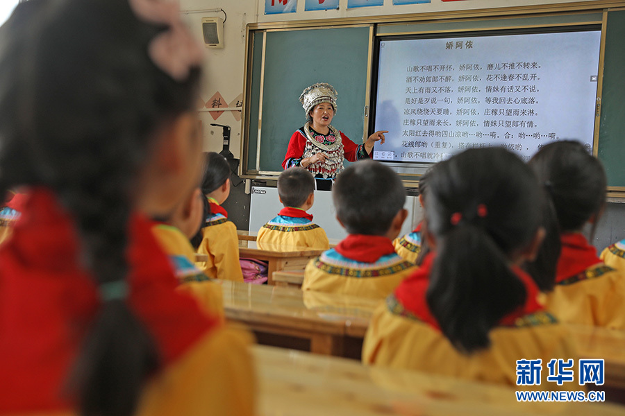 在教室內(nèi),任茂淑不僅面對面地教唱,還細心地為孩子們講解民歌的內(nèi)涵。她說,自己作為一名非遺傳承人,每學期都要到學校為孩子們教唱苗族民歌,通過傳承人走進課堂的方式,讓更多學生了解苗歌、傳唱苗族民歌,更好地保護和傳承這一非物質文遺產(chǎn)。新華網(wǎng)發(fā)(趙勇 攝)