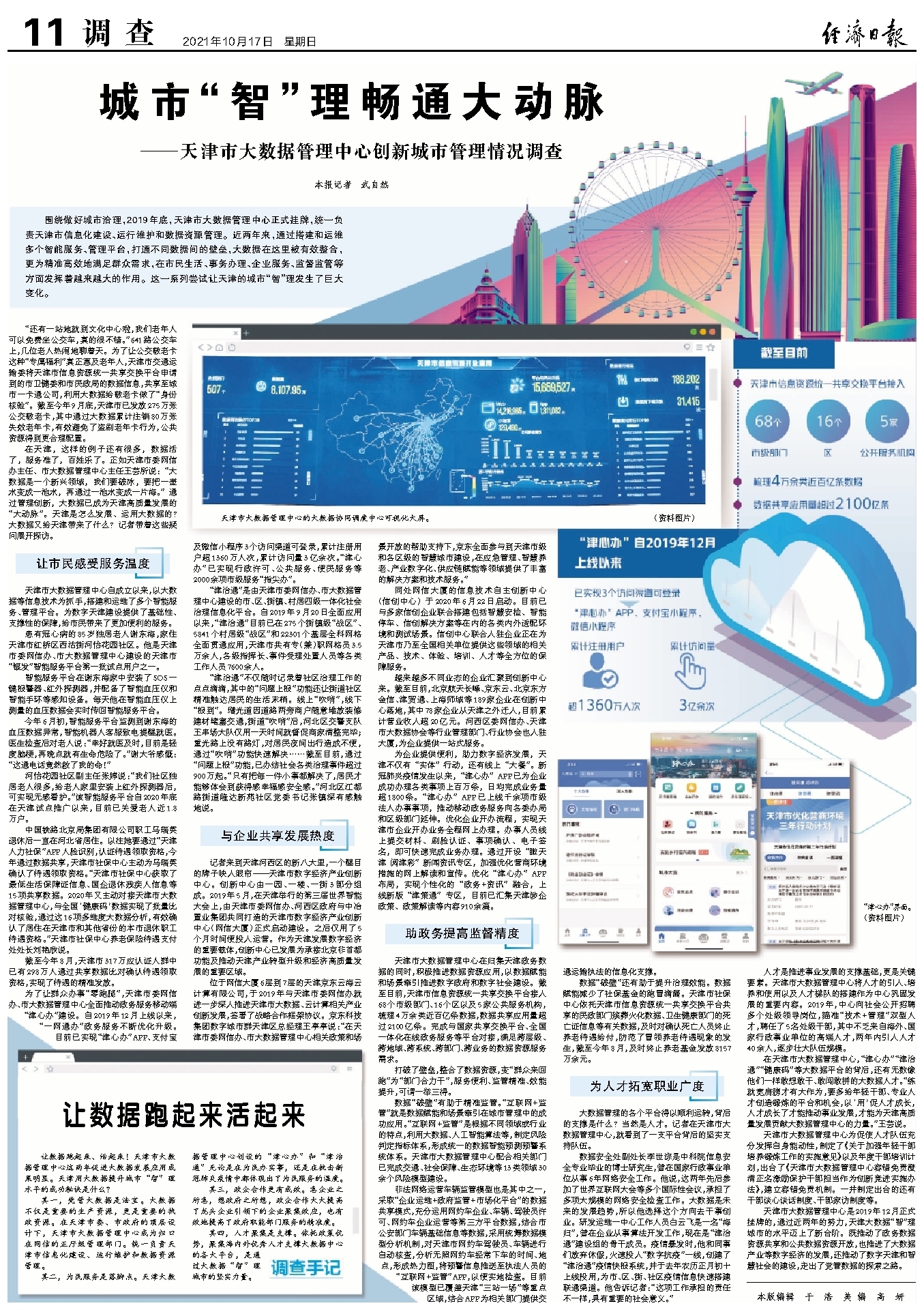 在天津,這樣的例子還有很多,數(shù)據(jù)活了,服務(wù)準(zhǔn)了,百姓樂(lè)了。正如天津市委網(wǎng)信辦主任、市大數(shù)據(jù)管理中心主任王蕓所說(shuō):“大數(shù)據(jù)是一個(gè)新興領(lǐng)域,我們要破冰,要把一壺水變成一池水,再通過(guò)一池水變成一片海。”通過(guò)管理創(chuàng)新,大數(shù)據(jù)已成為天津高質(zhì)量發(fā)展的“大動(dòng)脈”。天津是怎么發(fā)展、運(yùn)用大數(shù)據(jù)的?大數(shù)據(jù)又給天津帶來(lái)了什么?記者帶著這些疑問(wèn)展開(kāi)探訪。