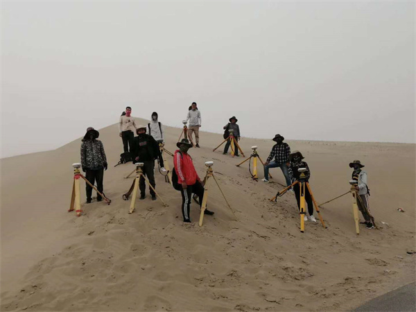 后來,唐飛帶領(lǐng)團(tuán)隊又前往新疆若羌,為中鐵一局三公司和若鐵路項目進(jìn)行前期控制網(wǎng)復(fù)測。項目線路長、地廣人稀,且地處塔克拉瑪干沙漠邊緣。為了節(jié)省時間,每天早上他和隊員背著馕、咸菜、礦泉水出發(fā),在沙漠戈壁一測就是十二個小時,晚上八九點左右才能回去吃口熱飯。有一次,他們在工地上測量時,突遇沙塵暴,他和三個組員趕快收拾儀器,裝進(jìn)儀器箱,四個人圍在一起,等著沙塵暴過去。