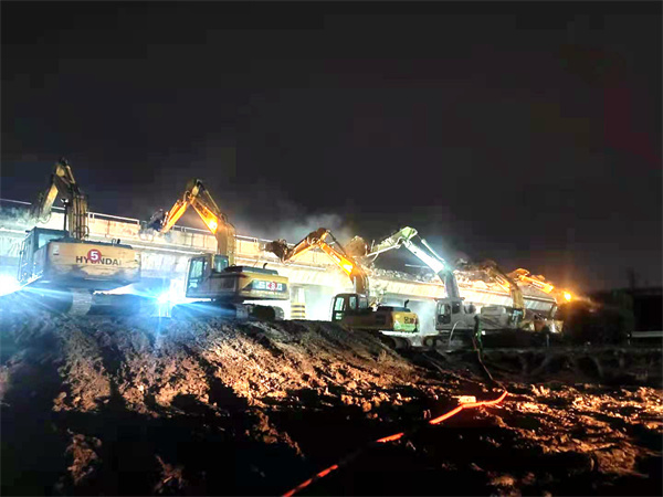 在施工現(xiàn)場,隨著指揮員的一聲令下,50多臺設(shè)備齊裝上陣,轟隆作業(yè)。由于該兩座橋同時上跨京滬高速公路,現(xiàn)場作業(yè)空間有限。為確保此次拆橋任務(wù)安全順利進(jìn)行,同時降低施工影響,京滬高速公路HA4標(biāo)項(xiàng)目部對施工現(xiàn)場進(jìn)行詳細(xì)調(diào)查,多次組織召開專家施工方案評審會,反復(fù)論證,細(xì)化橋梁拆除方案,精準(zhǔn)把控施工計(jì)劃;項(xiàng)目部領(lǐng)導(dǎo)班子和管理人員,全稱盯控,確保拆除工作萬無一失。