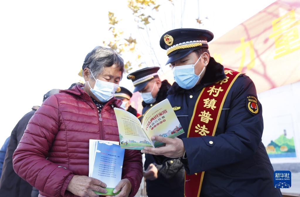 12月4日,在河北省邢臺(tái)市襄都區(qū)東郭村鎮(zhèn)南康莊村,普法志愿者在給村民進(jìn)行普法宣傳。新華社發(fā)(張馳 攝)