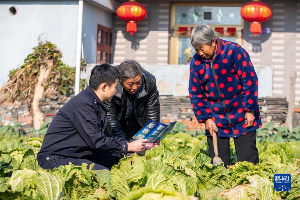 12月4日,江蘇省泰州市海陵區(qū)蘇陳派出所民警在蘇陳社區(qū)田間地頭向農(nóng)戶進(jìn)行普法宣傳。 新華社發(fā)(湯德宏 攝)