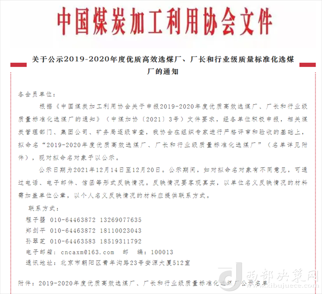 西部決策網(wǎng)訊12月14日,從中國(guó)煤炭加工利用協(xié)會(huì)傳來(lái)喜訊,陜煤集團(tuán)陜北礦業(yè)檸條塔公司選煤廠榮獲2019-2020年度行業(yè)級(jí)質(zhì)量標(biāo)準(zhǔn)化選煤廠。