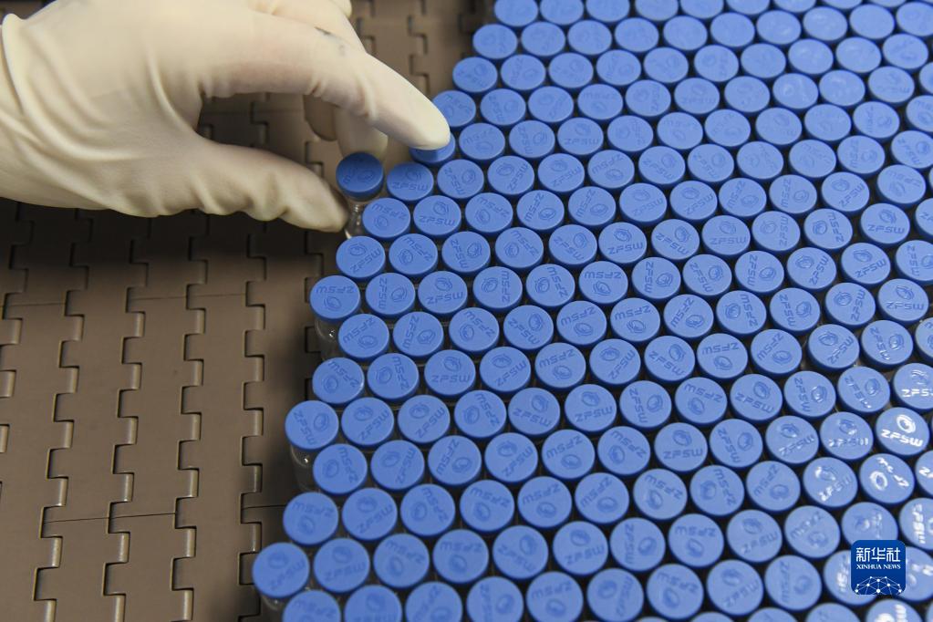 在安徽智飛龍科馬生物制藥有限公司新冠疫苗生產(chǎn)線上,工作人員對疫苗進行人工檢測(5月25日攝)。新華社記者 張端 攝
