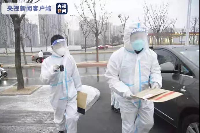 12月25日,外賣人員張欣(左一)在西安市小寨東路一封控小區(qū)配送蔬菜。這幾天,他的業(yè)務(wù)量是平時的兩倍。新華社記者 陶明 攝
