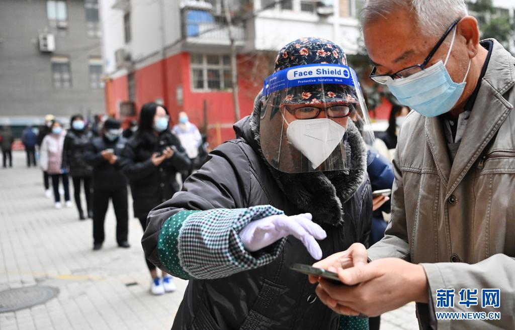 12月27日,志愿者李穎(前左)在社區(qū)核酸篩查現(xiàn)場協(xié)助居民出示健康碼。新華社記者 陶明 攝
