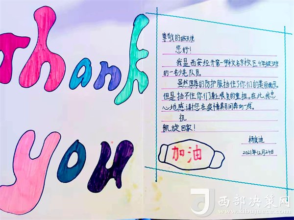 三九嚴(yán)冬,雪花紛飛,寒風(fēng)刺骨。12月24日,一大早,我和隊(duì)員們?cè)缭绲街付ǖ攸c(diǎn)集合,等待分配任務(wù)。看到護(hù)理姐妹們個(gè)個(gè)兒都精神飽滿(mǎn)、整裝待發(fā),我的心情是又緊張又激動(dòng)。當(dāng)我們到達(dá)任務(wù)采集地點(diǎn)時(shí),社區(qū)工作人員和志愿者同志為我們搭建了一個(gè)簡(jiǎn)易帳篷。帳篷四翼隨風(fēng)飄揚(yáng),凜冽的寒風(fēng)襲進(jìn)帳篷,如同置身風(fēng)口一樣。一切準(zhǔn)備就緒,換上防護(hù)用品,立即開(kāi)展工作。室外溫度達(dá)零下五度,我們認(rèn)真地為每位居民采集核酸。采集完核酸后,做到一人一消,隊(duì)員的手都凍得通紅麻木,已經(jīng)感覺(jué)不到疼痛,面屏上都已經(jīng)霧氣籠罩,但是,隊(duì)員們沒(méi)有一個(gè)人喊累、沒(méi)有一個(gè)人退縮,更沒(méi)有一個(gè)人喊停。這時(shí),耳畔傳來(lái)一聲,“孩子,辛苦了,這是我給你們送的熱水,” “我家有熱寶,給你們?nèi)∪∨?rdquo;“姐姐,謝謝你們,”說(shuō)著,一個(gè)小女孩走過(guò)來(lái),送來(lái)兩張自己做的小賀卡,上面寫(xiě)的都是感謝的話(huà)語(yǔ)。