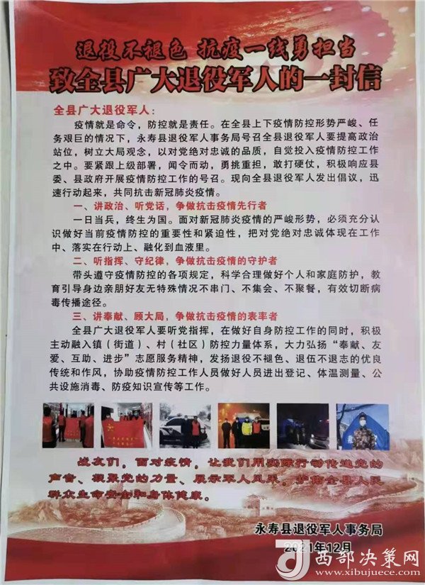 西部決策網(wǎng)訊(王江) “我志愿加入永壽縣退役軍人志愿者服務(wù)隊(duì),不記報(bào)酬,不論生死,聽從黨和政府安排,絕不退后!退役不褪色、退伍不落伍、轉(zhuǎn)業(yè)不轉(zhuǎn)志”,退役軍人依然是人民的子弟兵,心中時(shí)刻裝著祖國和人民,在新型肺炎疫情來襲之際,退役軍人紛紛請(qǐng)戰(zhàn)。