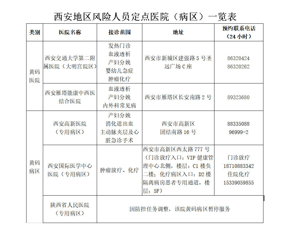 目前,經(jīng)省市協(xié)調(diào),西安地區(qū)已設(shè)立“黃碼醫(yī)院”2家“黃碼病區(qū)”2個(名單見下表),后續(xù)開設(shè)的“黃碼醫(yī)院”“黃碼病區(qū)”等風(fēng)險人員定點(diǎn)醫(yī)院(病區(qū))由地市自行發(fā)布。