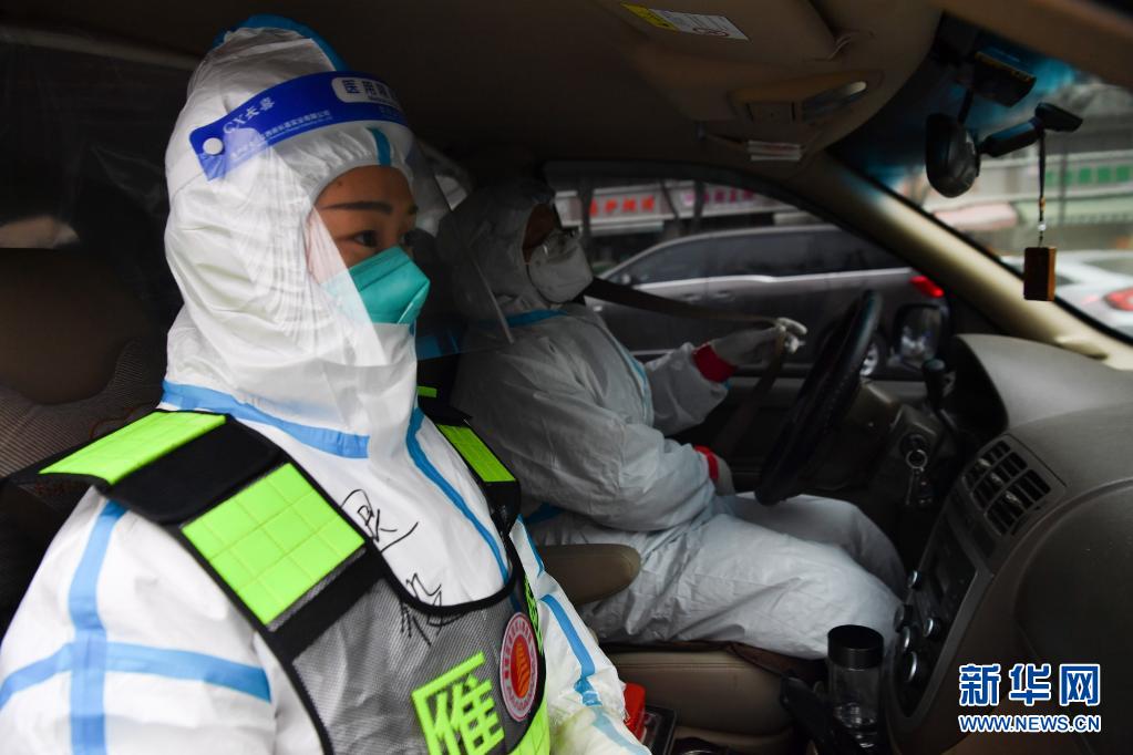 退役軍人志愿突擊隊隊員(左)準(zhǔn)備出發(fā)轉(zhuǎn)運(yùn)核酸檢測樣本。新華社記者 張博文 攝