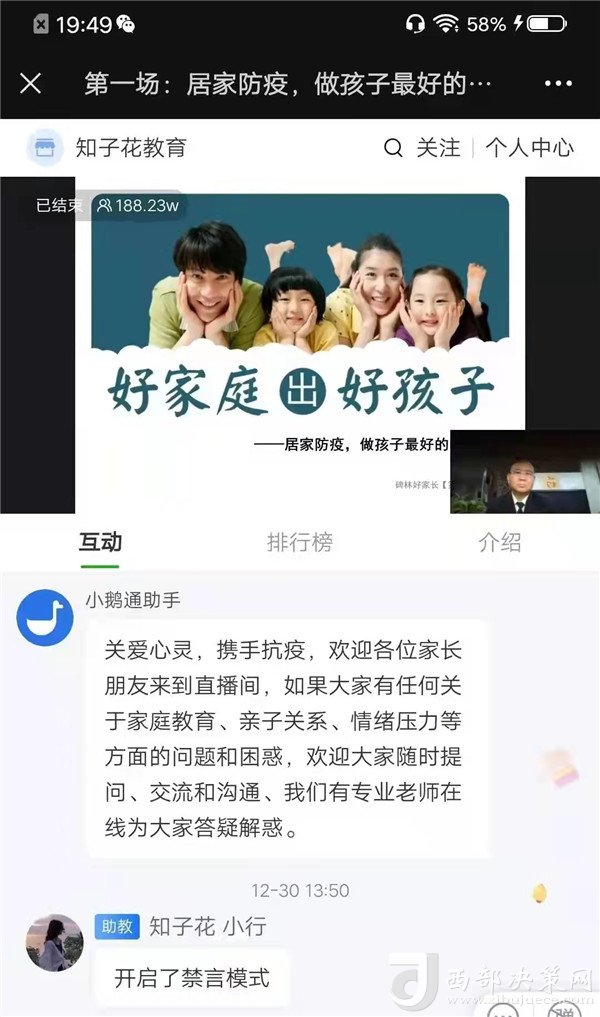 西部決策網(wǎng)訊 面對當(dāng)前嚴(yán)峻的疫情防控形勢,為了貫徹落實渭南潼關(guān)縣教科局“停課不停學(xué)”的工作部署,潼關(guān)縣城關(guān)二中全面開展了線上教育教學(xué)活動。為了更好的幫助全校師生及學(xué)生家長保持平和心態(tài),處理好“停課不停學(xué)”中,教師、學(xué)生及學(xué)生家長可能出現(xiàn)的心理問題,進(jìn)行有效的心理調(diào)試,潼關(guān)縣城關(guān)二中組織全校師生及學(xué)生家長觀看了陜西省教育廳舉辦的《心理健康暨家庭教育》線上直播講座,各位心理專家根據(jù)不同的人群進(jìn)行了正確有效的心理輔導(dǎo)與科學(xué)的指導(dǎo),為全體師生和學(xué)生家長筑起了抗疫“心”防線。