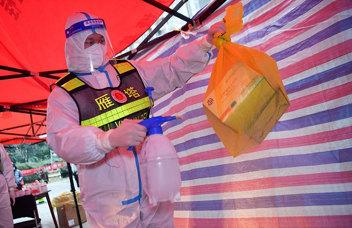 ↑1月7日,西安市雁塔區(qū)退役軍人志愿突擊隊(duì)隊(duì)員桑海鑫為核酸檢測樣本外包裝消毒。