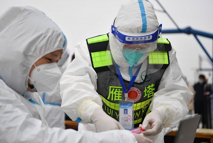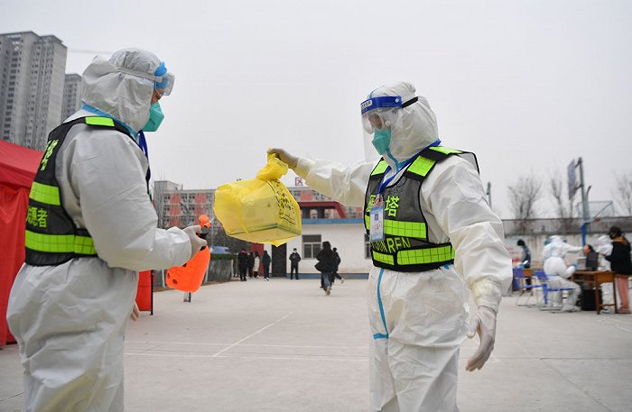 ↑1月7日,西安市雁塔區(qū)退役軍人志愿突擊隊(duì)隊(duì)員鄒浩東(右)在一處核酸檢測點(diǎn)與工作人員交接核酸檢測樣本。