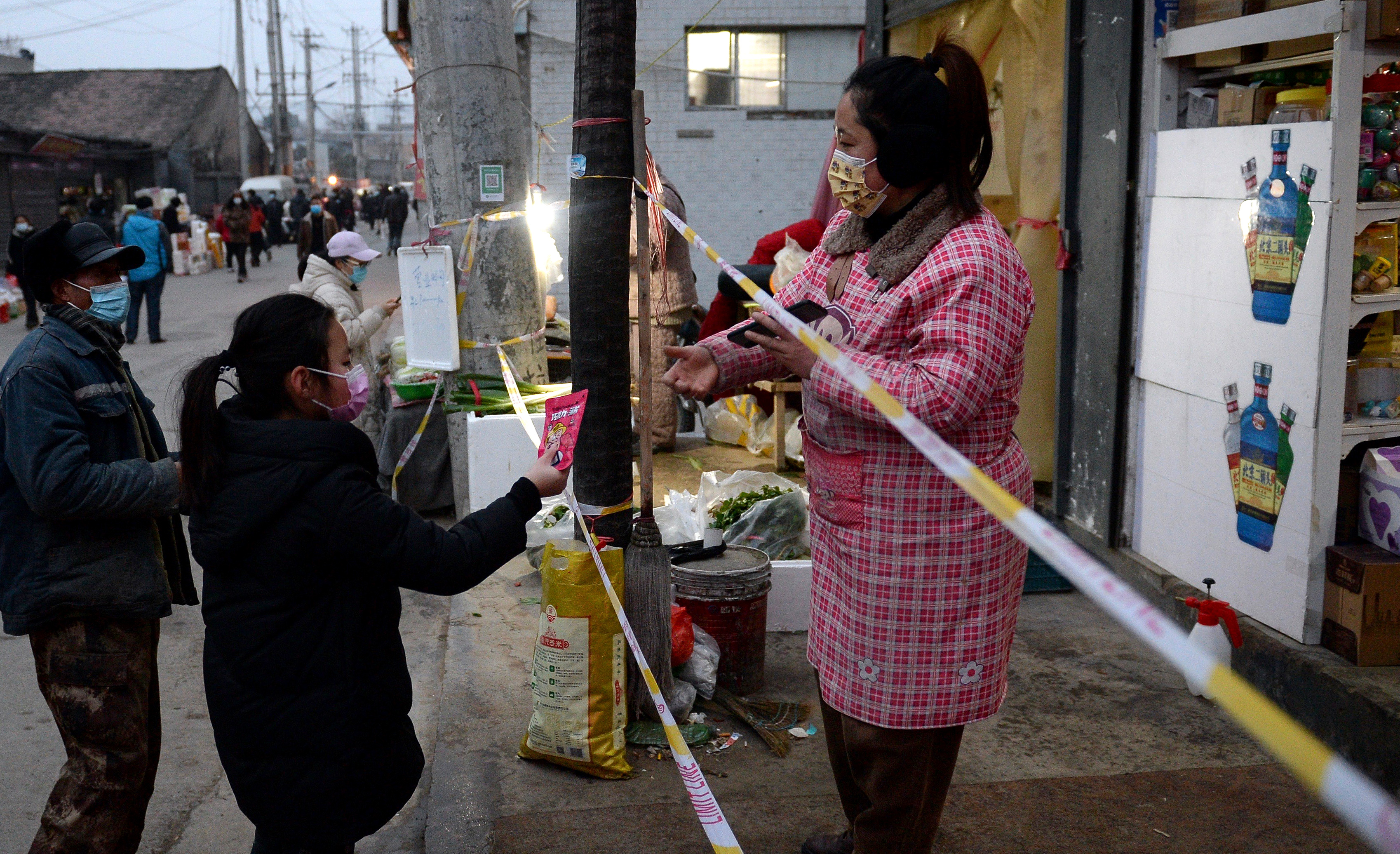 在趙軍曉的對(duì)面是一家饅頭店,三列銀白色的不銹鋼蒸籠堆得比人高,不時(shí)“噗噗”地冒著熱氣。上層的饅頭色白、圓潤(rùn)而飽滿,不斷被店主一齊摟進(jìn)袋子,遞給警戒線外的排隊(duì)購(gòu)買的三五村民。“他們家的饅頭好吃!”村民薛東紅剛采購(gòu)了兩個(gè)白蘿卜、三顆大白菜,打算再買幾袋饅頭就回家,“我家還有十多個(gè)房客,多買點(diǎn)也能給大家分一分。”她說。