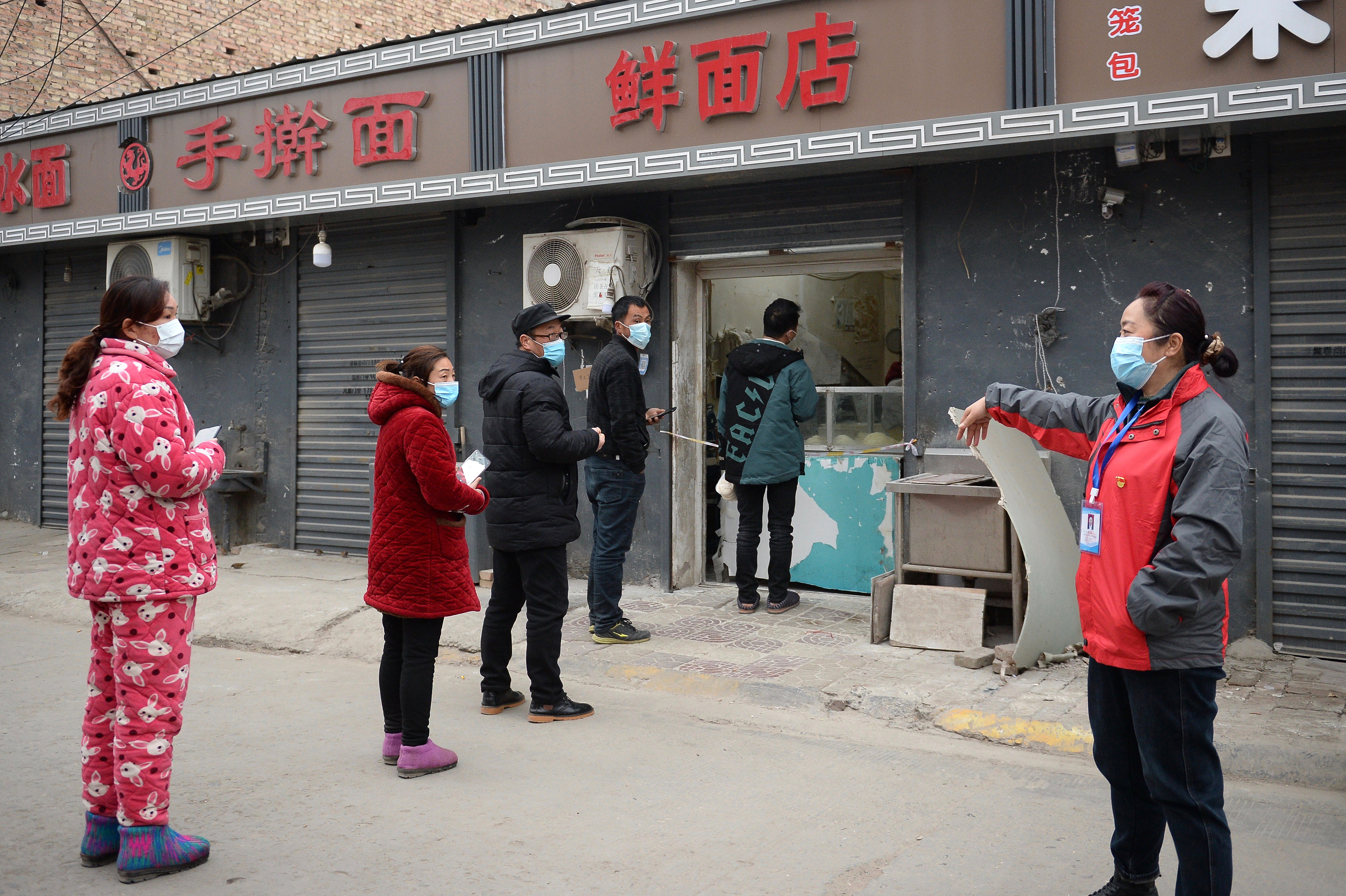 西安市未央?yún)^(qū)未央街道西唐寨村的志愿者在維持村民購(gòu)物秩序(1月7日攝)。