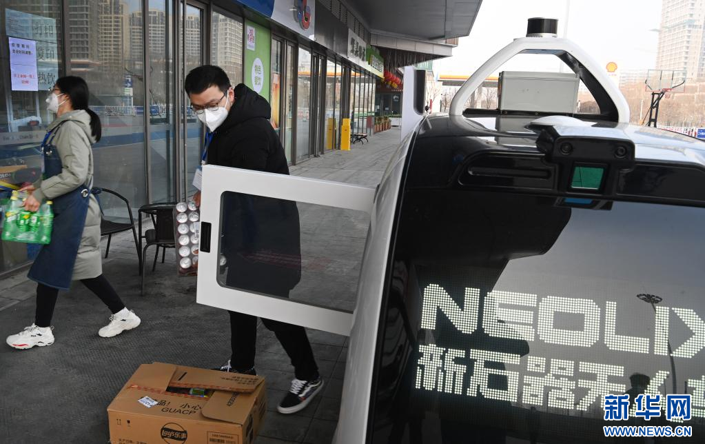 1月9日,無人配送車到達(dá)目的地,便利店主人在接收貨品。新華社記者 陶明 攝