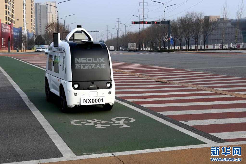 1月9日,無人配送車行駛在西咸新區(qū)灃西新城灃景路上。新華社記者 陶明 攝