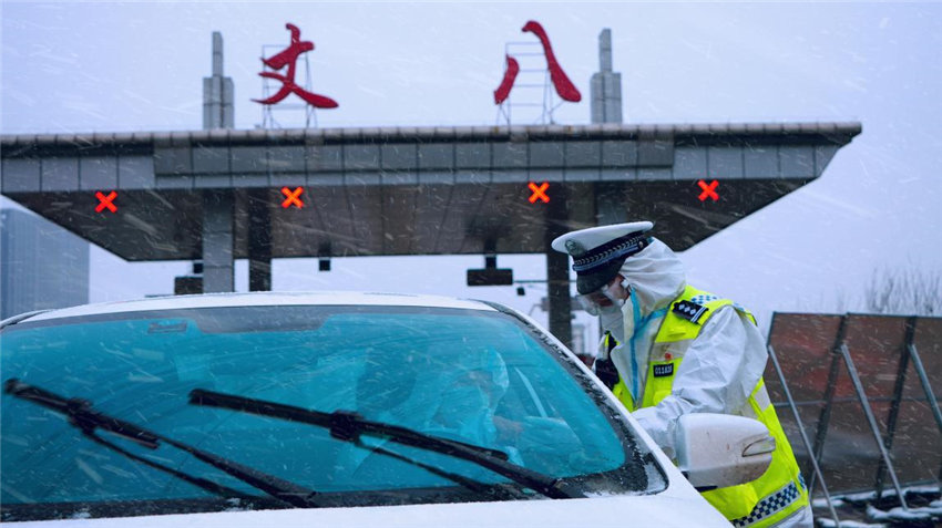 臨退休民警朱永強(qiáng)雪天值守抗疫一線(xiàn)。