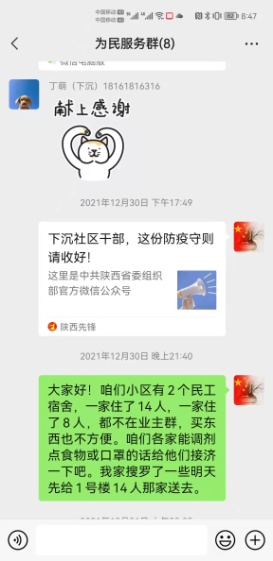看著手里拎的幾顆白菜、蘿卜、西紅柿,我感到慚愧難當(dāng),作為一名黨員、一名下沉干部,實(shí)在是失職,沒有履行好“民之所憂,我必念之;民之所盼,我必行之”的使命擔(dān)當(dāng)。投送完愛心菜到家后,我立即在群里倡議小區(qū)下沉干部對1-3-2302的務(wù)工人員開展愛心救助活動,并從自家的抗疫儲備物資里勻出了2袋子蔬菜、豆腐乳、魚醬罐頭、口罩、水果等物資,并附上了溫馨小紙條,寫上我的聯(lián)系電話,鼓勵他們堅定克服困難的信心和決心。第二天,社區(qū)領(lǐng)導(dǎo)、小區(qū)鄰居們得知情況后,紛紛伸出援助之手,不到半小時,鍋灶有了、菜刀案板有了、糧食蔬菜也都有了…,社區(qū)的慰問品也送來了。大伙不僅給他們送去了物資,更送去了關(guān)心和安慰,他們的生活起居也迅速融入了小區(qū)大家庭,業(yè)主群里每天都有人對他們噓寒問暖,他們也經(jīng)常在業(yè)主群曬他們做的川味美食。他們私下跟我說,這幾年,他們在湖北、新疆等地都遇到過疫情,但最讓他們感動的還是西安,黨和政府的細(xì)致安排、西安人民的熱情相助,讓他們在他鄉(xiāng)異地孤立無援時,第一次感到不慌了。