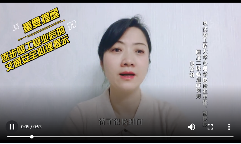 隨著西安復(fù)工復(fù)產(chǎn)的推進(jìn),“開車出門”成了恢復(fù)常態(tài)化防控之后,很多市民面臨的第一件事。今天(1月15日),西安交警邀請?jiān)渚こ檀髮W(xué)心理學(xué)教研室主任、副教授,國家二級心理咨詢師倪文娟,提醒駕駛員在家中狹小的空間內(nèi)長時間封閉后,如何保持安全出行心態(tài)。