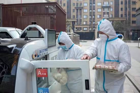 關(guān)好柜門后,白色小車便沿著設(shè)定軌道緩緩駛向附近的鳳鳴小區(qū)。穿著防護(hù)服的工作人員早已等候在指定位置,他們打開寫有樓棟號的柜門取出貨物,關(guān)上柜門后,小車又自動駛向下一站……這種科技感十足的配送方式,既提高了效率,又實現(xiàn)了全程無接觸精準(zhǔn)配送。