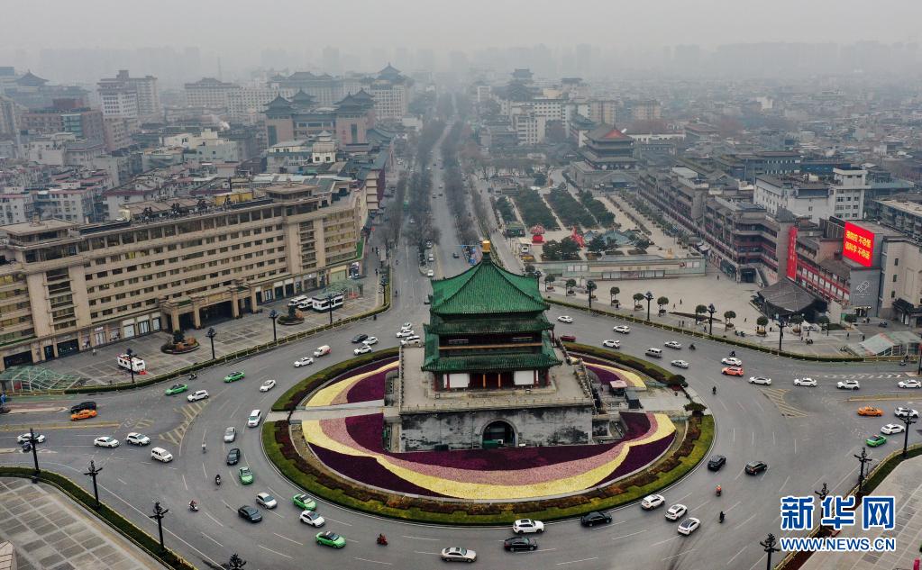 1月22日,西安市鐘樓盤(pán)道再現(xiàn)車(chē)水馬龍的景象(無(wú)人機(jī)照片)。新華社記者 陶明 攝